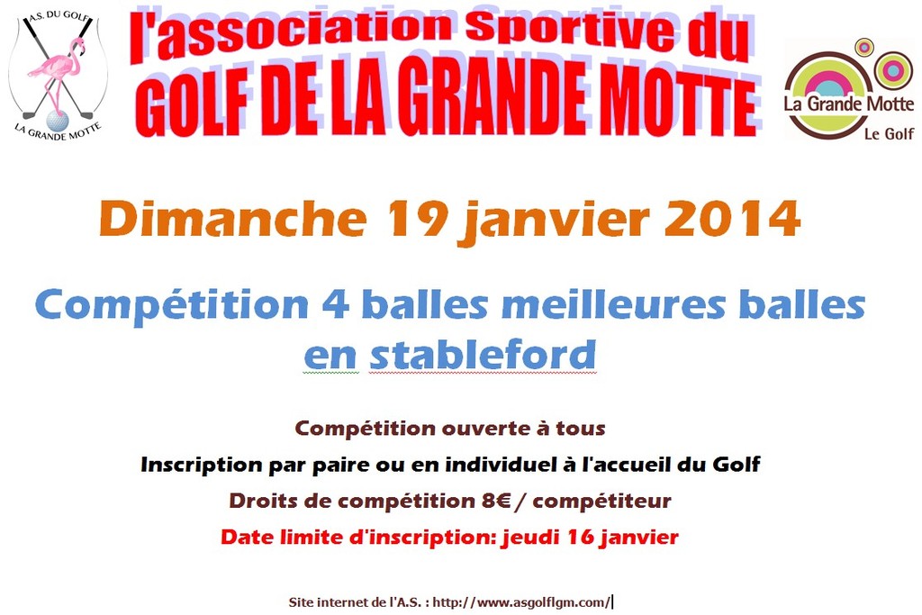 Première compétition de l'année 2014 organisée par l'Association Sportive : formule quatre balles meilleures balles, le dimanche 19 janvier, les inscritptions sont ouvertes auprès de l'accueil du Golf (04 67 56 05 00).